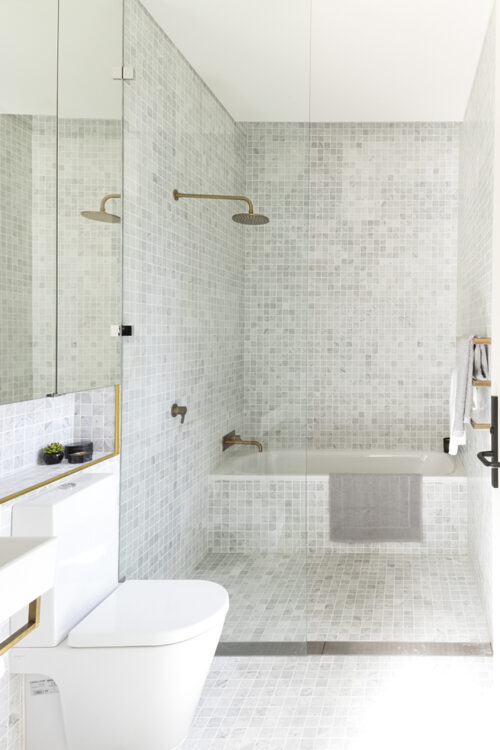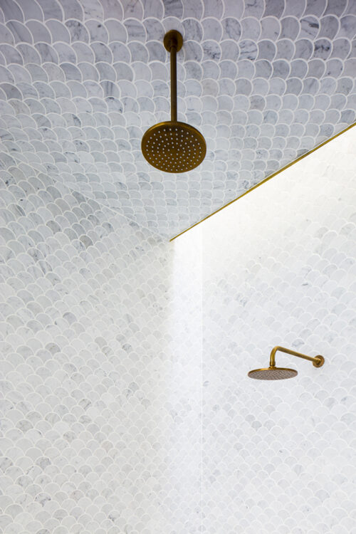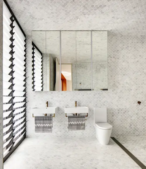 black brick-bond tiling to exterior walls, bathrooms in grey and white marble