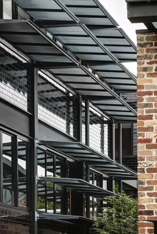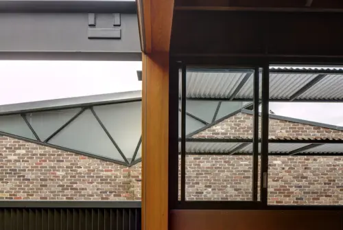 the warehouse are incorporated as courtyard walls, with this outdoor oasis centred around a pond lined in recycled bricks. The robust palette includes