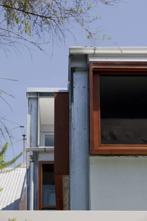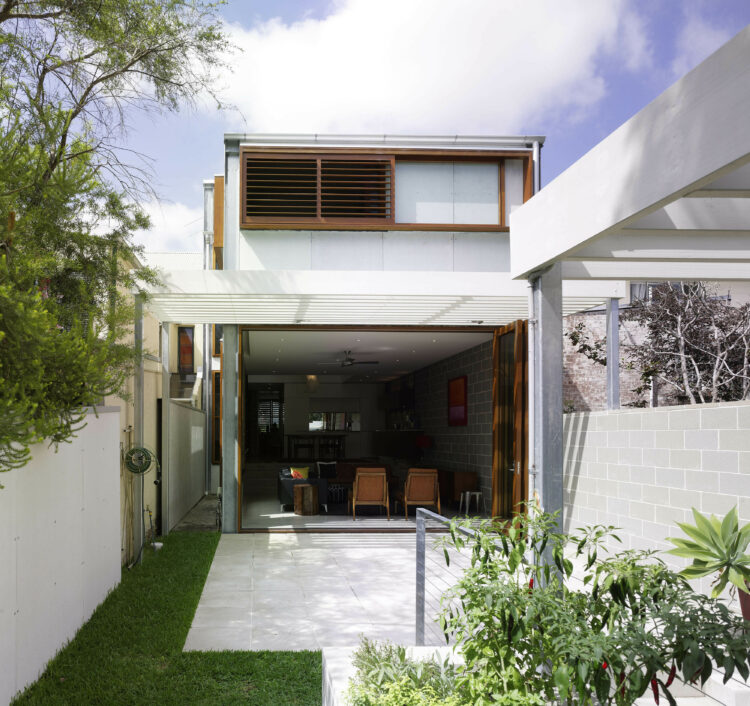 Behind the facade’s tall timber shutters, the interior is rigorously planned, with areas and elements designed for dual purpose. Deep timber windowsills double as casual seating, while the over-sized first-floor corridor also functions as a play-space.