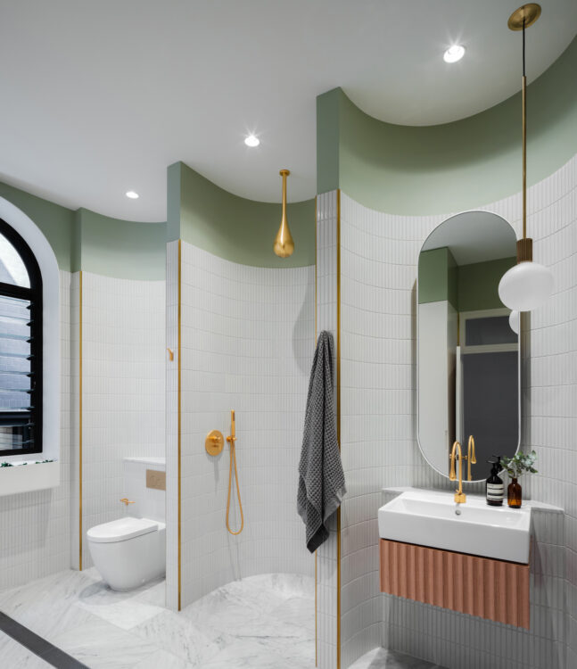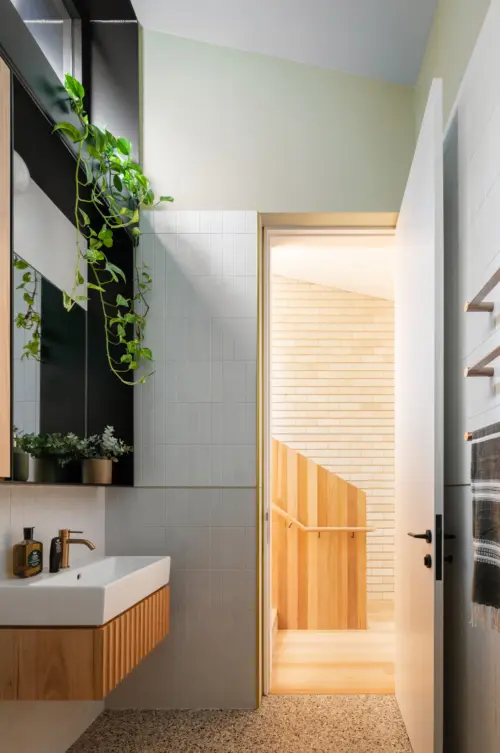 The two-storey rear addition adds two bedrooms and a bathroom upstairs, with a downstairs living, dining and kitchen area bookended by nature. Stitching old and new together is a timber-lined staircase adjoining a central light well that brings daylight, fresh air, and a garden pocket to the centre of the plan.