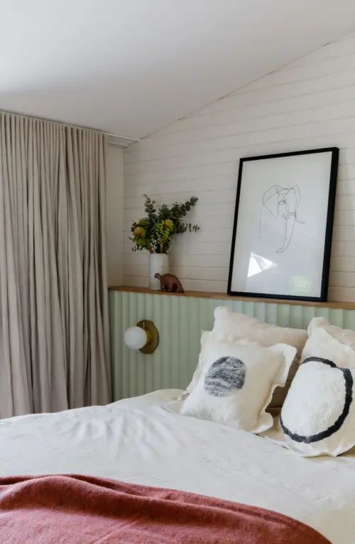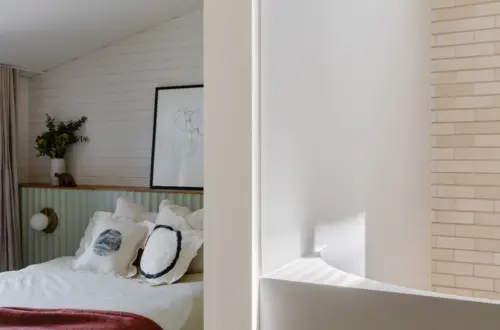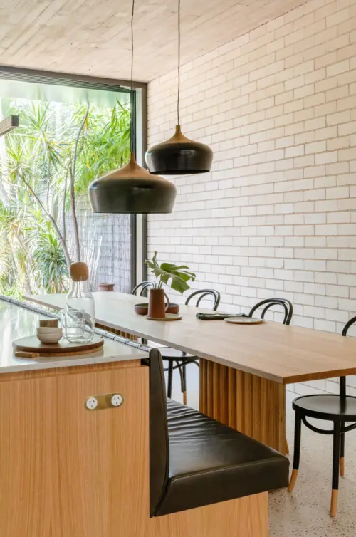 Robust materials lend strength and warmth. Blonde brick walls rise to a lime-whitened concrete ceiling, impressed with timber grain. Details include a scalloped skylight above the living space and fluted walls in the bathroom. The result is a cheerful, calming and clever set of spaces, at home in the urban wilds of Sydney.