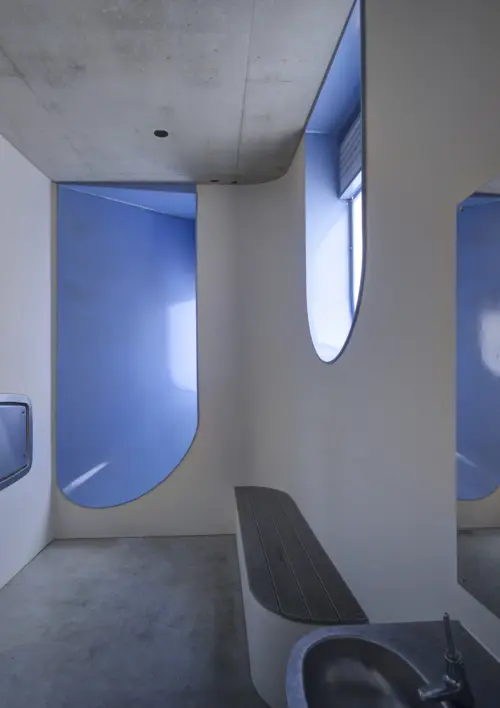The amenities feature bespoke detailing not typically afforded to public bathrooms, including skylights, textured and rendered interior walls, playful windows, arched niches and attentive finishes.