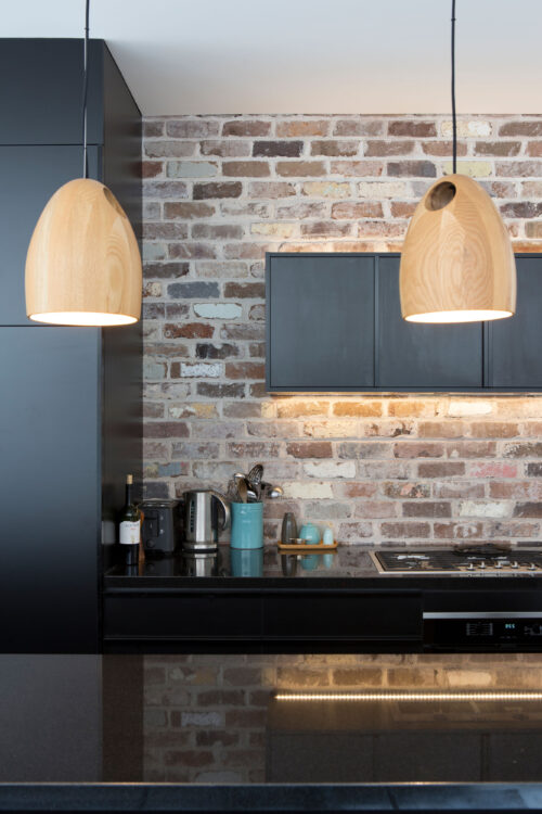 At ground level, sleek black joinery anchors the kitchen against a wall of recycled bricks that add texture and rustic variation. Sun from a shuttered skylight warms the living room, while its cool concrete floor bleeds out into the compact garden.