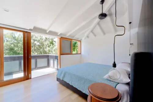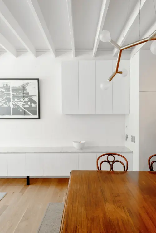 black and white wormed with wood. This continues downstairs with white-washed brick walls and ceiling beams, oak flooring, and an expansive timber-framed pivoting door that opens out to a verdant little garden.