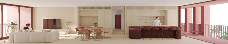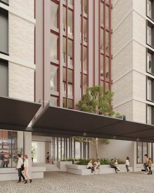Individual buildings are connected with a shared materiality of earthy brickwork and pigmented clay concrete reflective of the context and history of the area. Simple but texturally rich, robust and refined, this palette sits comfortably as a family of related materials while allowing each building to have its own unique identity and character.