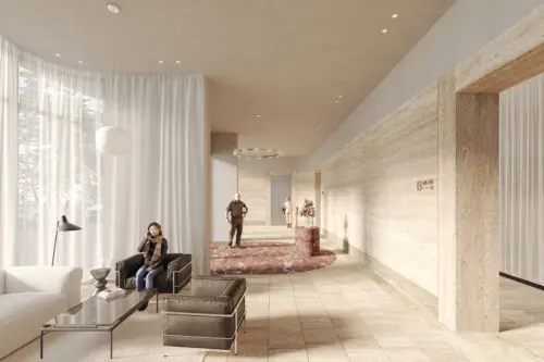 Small gestures have big impacts across the scheme. Articulated facades provide clear points of entry, sharing a design language that is expressed differently across each building. Clearly defined, consolidated central lobbies provide an obvious street address, welcoming residents home while making it easy for the takeaway delivery, ride share pickup, or parcel drop to occur. Private open space is co-located with communal spaces so that the key shared facilities of the apartments share a physical and visual connection. Gathering spaces are placed adjacent to existing parks for improved amenity, with this pedestrian focus continued in the locating of basement entries away from green spaces.