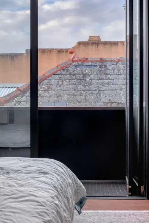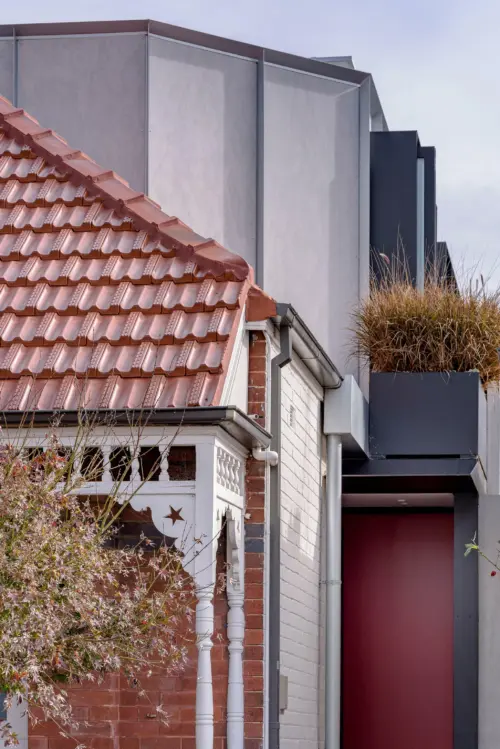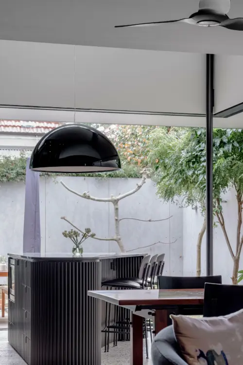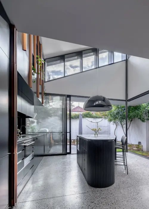 kitchen is now central to the indoor/outdoor domain, contained under a dramatic light-filled void. Materials combine the traditional and contemporary