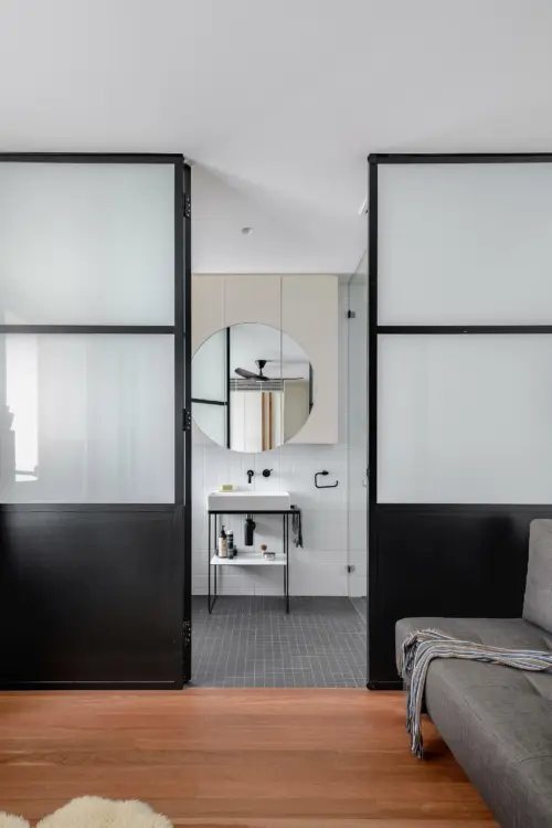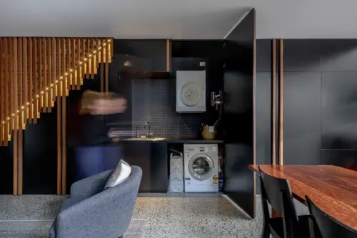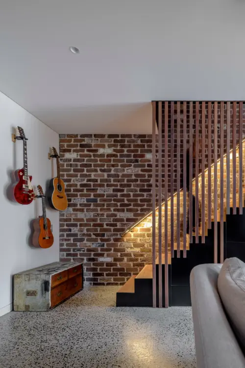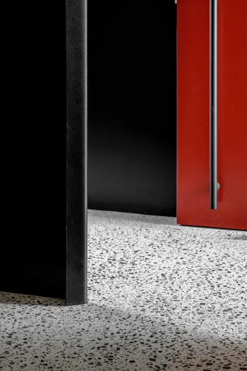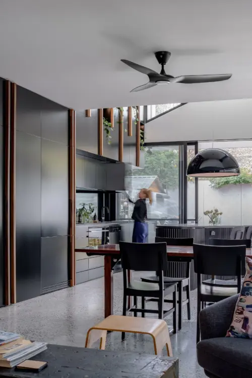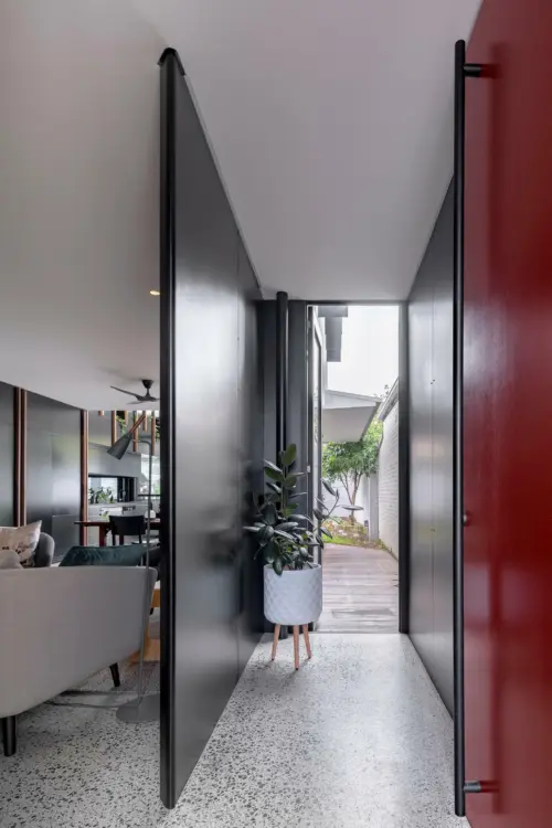 kitchen benchtops, and joinery with timber accents. A textured terrazzo floor guides the path from front to rear. Sculptural details from the subtle
