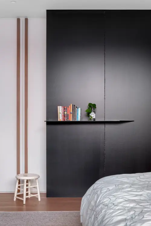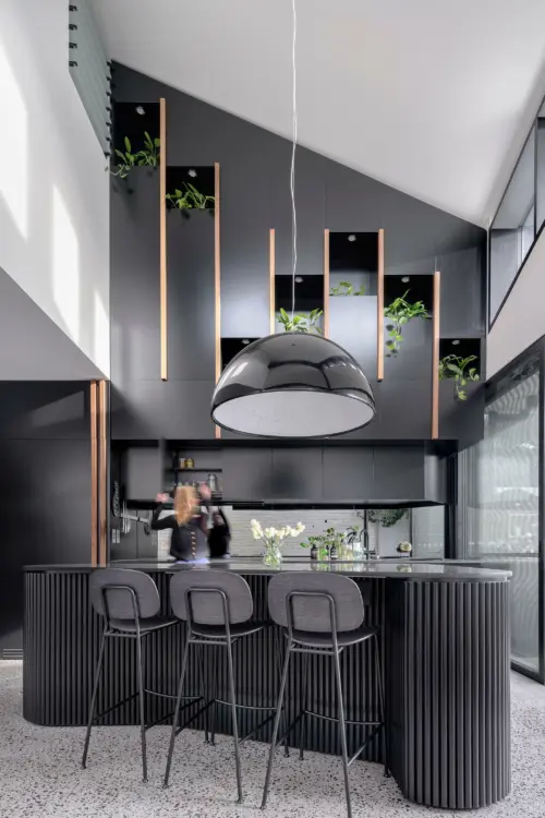 curve of a steel wall, to the fluted elliptical island bench and rhythmic vertical