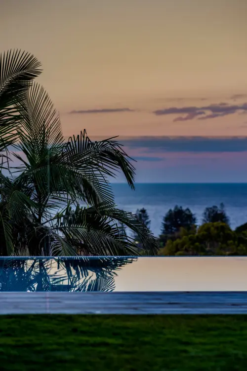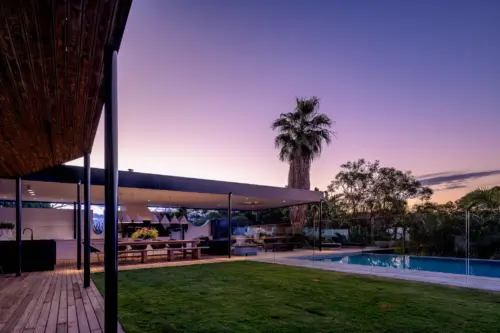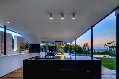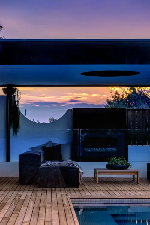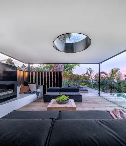 Cool is an all-weather poolside pavilion for a private Sydney home. A pampering platform with covered and open spaces framed by a low planar roof,