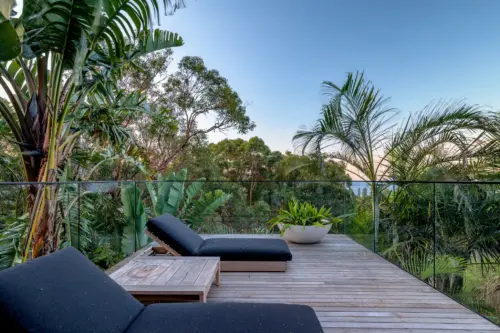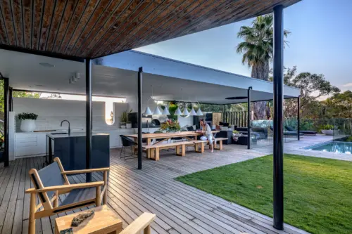 wall along the western edge tempers the sun and anchors a wood-fired pizza oven in the kitchen area and a fireplace in the living area. The timber deck