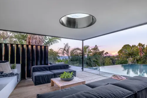 extends out beyond the roofline for sunbathing. A circular skylight brings sun