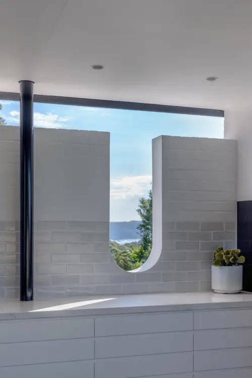 The pavilion completes the vision of an earlier project, Newport House, extending the sleek material palette poolside. A white-painted brick