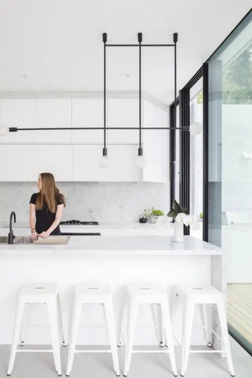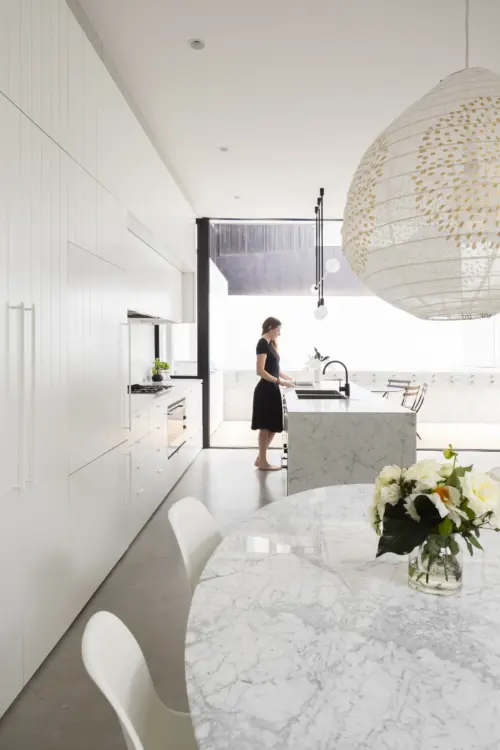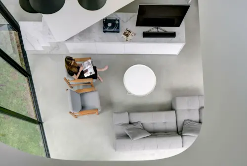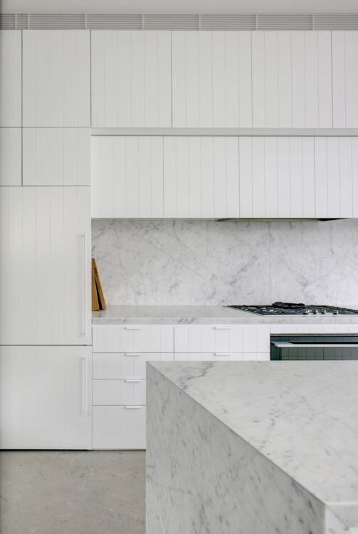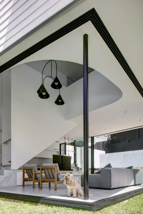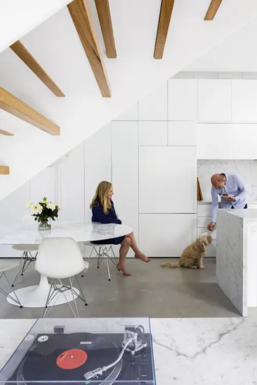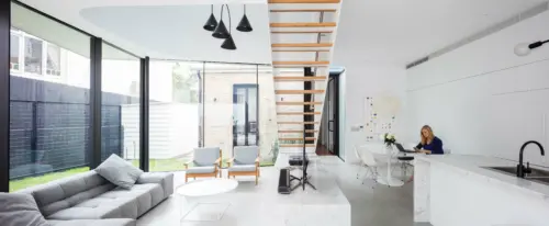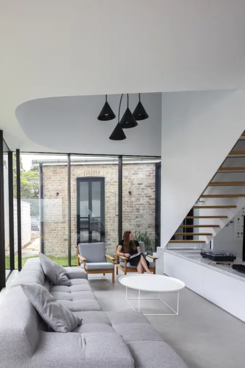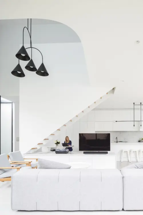 new living area and kitchen, rising through a sculptural void. Upstairs, a