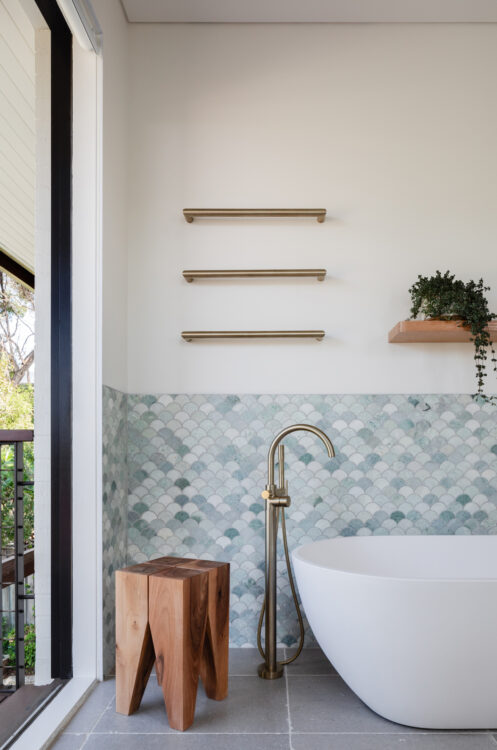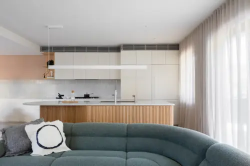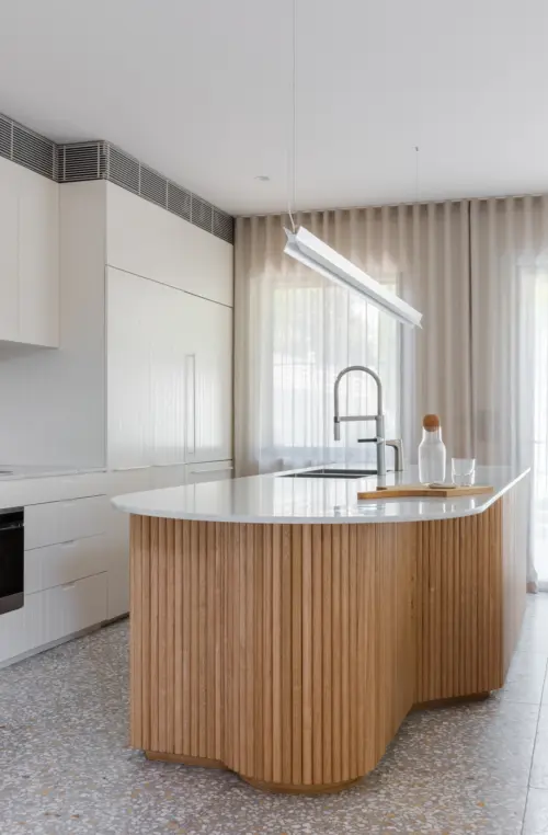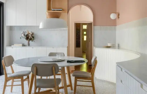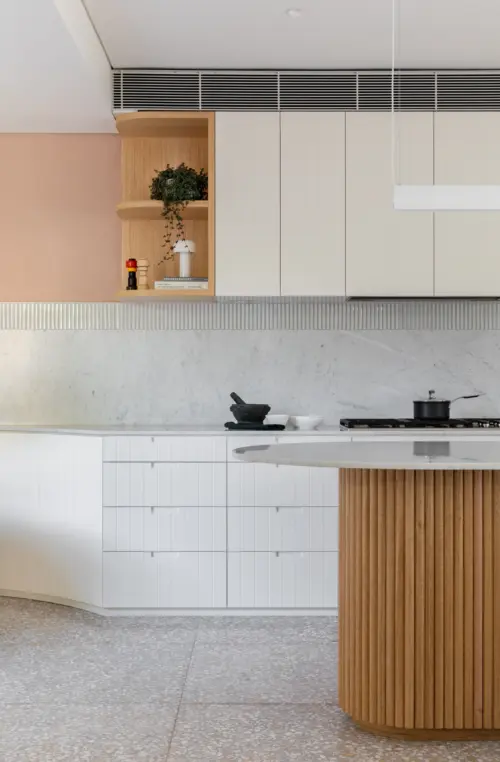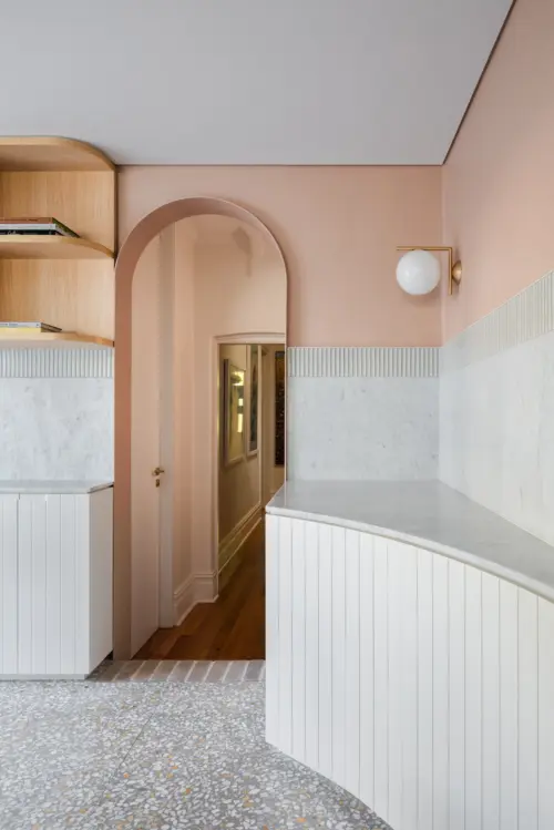 A Victorian-era terrace shakes off its guest house past with a rationalised plan and artful embellishments, restoring its former grandeur in a contemporary way. The palette of natural materials, fluted forms, warm pastels, and cool terrazzo flooring breathes new life into the interior with light and shade, texture, and detail.