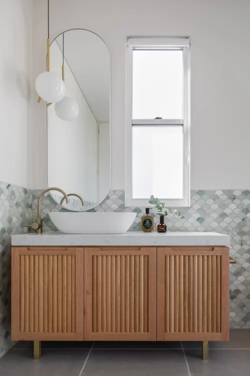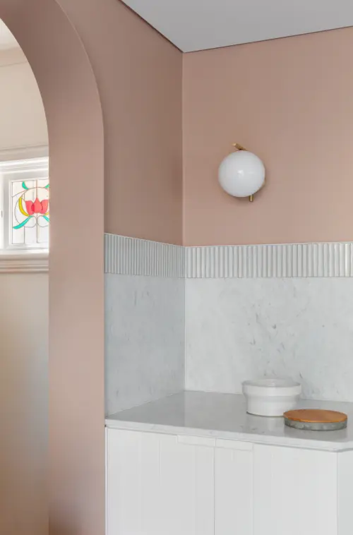 Colour is used confidently, from a pastel ochre pink in the public space to the bathroom’s opulent Ming green scalloped marble tiles. The deep rear garden is reorganised into three functional zones – a dining patio, a play lawn, and a swimming pool - to extend the living outdoors.