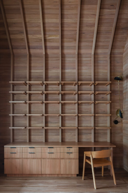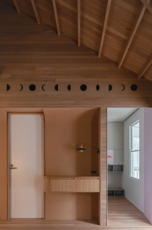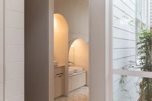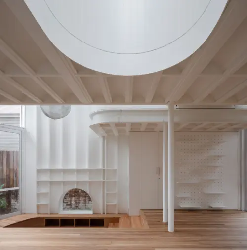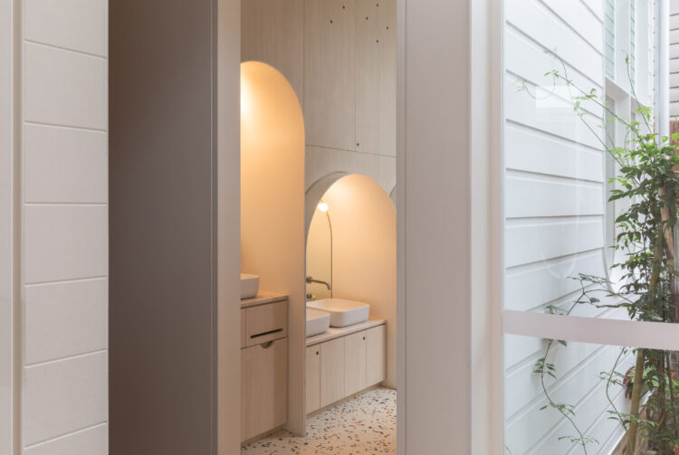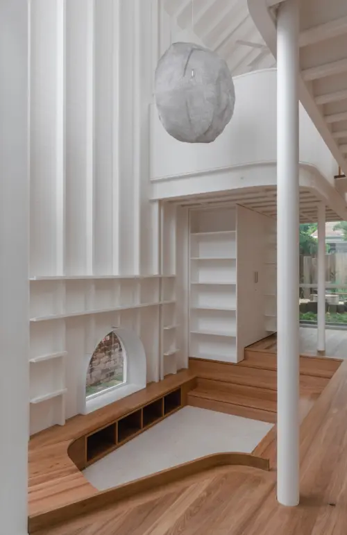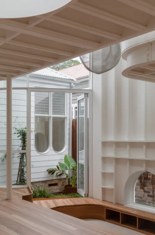 A weatherboard cottage adapted into an inspiring local community preschool. Behind its conserved domestic facade, a series of wildly creative spaces unfold, with plays of materiality, scale and form adding intrigue, drama and delight. The single-storey gabled facade is conserved and coloured crisp white, while a new double-height rear volume is added, imperceptible from the street, nestling into the garden. Inside, exposed timber rafters and lining boards artfully reinterpret the old material language, while the original brick chimney remains intact.