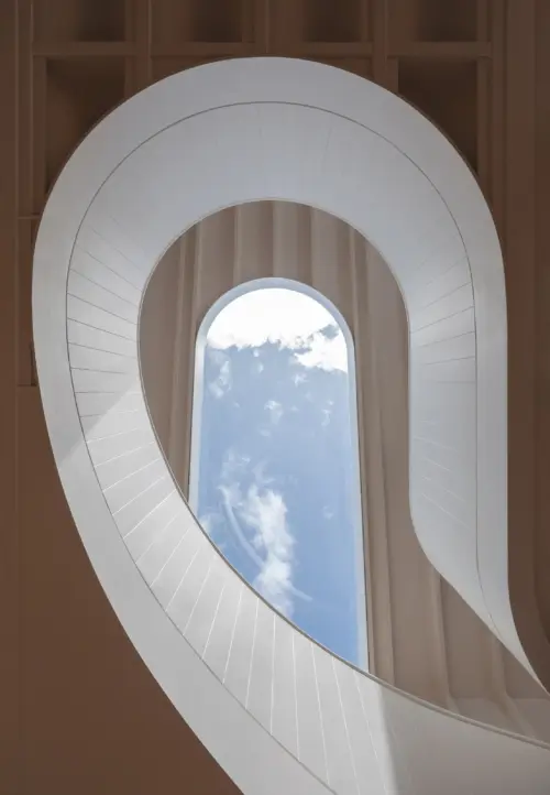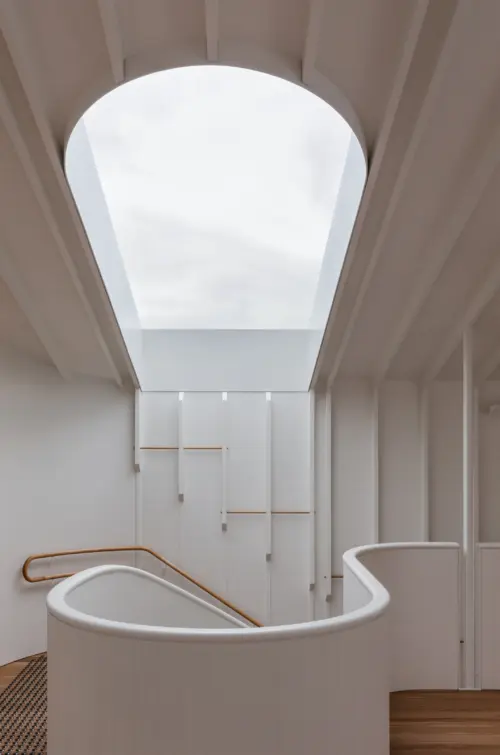 Entry is via a flexible space where parents and children can meet informally with teachers. Despite its volume, the timber-lined reception feels domestic and cosy. Playful elements throughout include curves and cutouts in windows, walls and joinery – book nooks and quiet caves for little ones to explore or retreat to. Between the sunken timber reading den and floating white mezzanines, an elliptical staircase is held in a teardrop void, crowned by a four-metre skylight through which clouds can be seen drifting by. The white-and-wood palette features blackbutt timber hand-carved handrails and stairs, and powder-coated steel is relieved where soft pastel colours from the bush are used in small, considered moments.