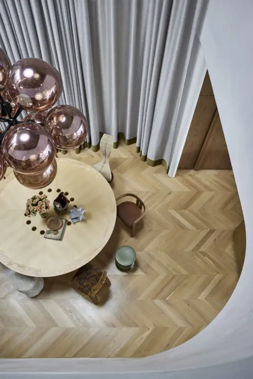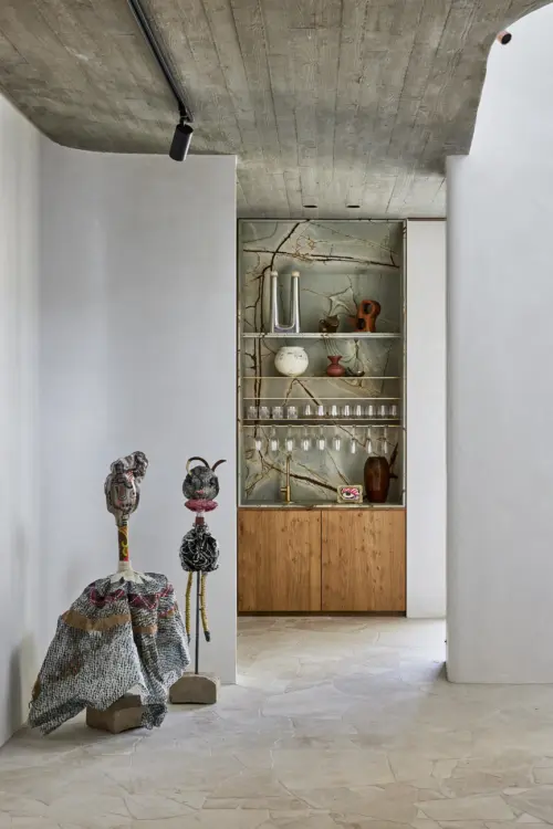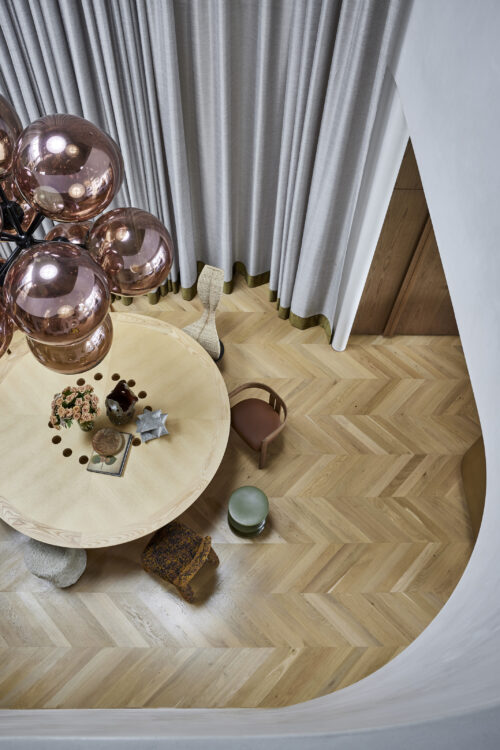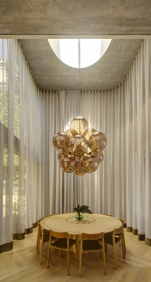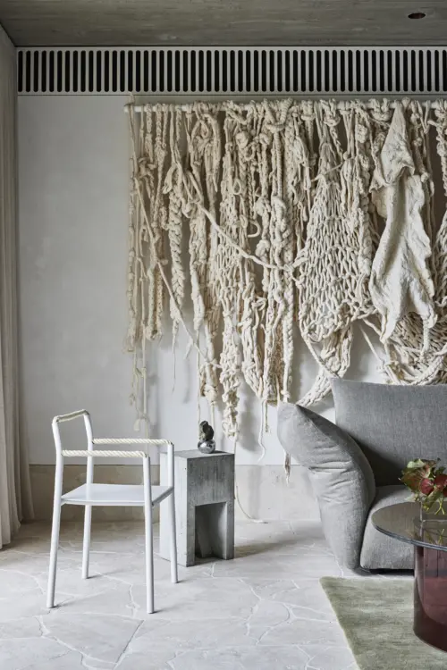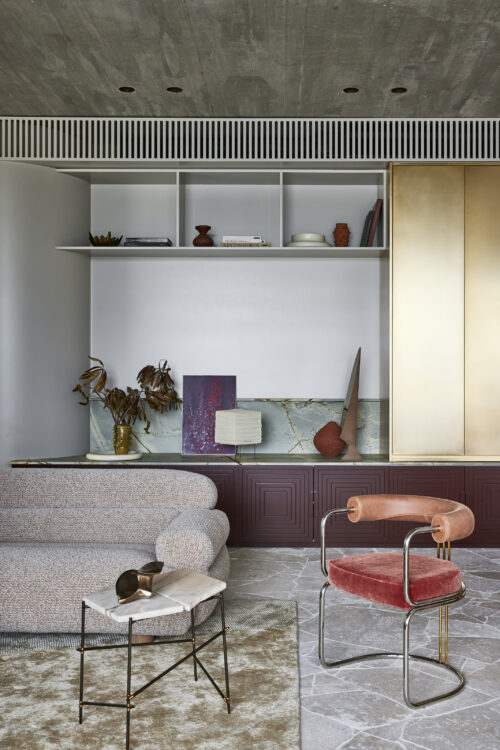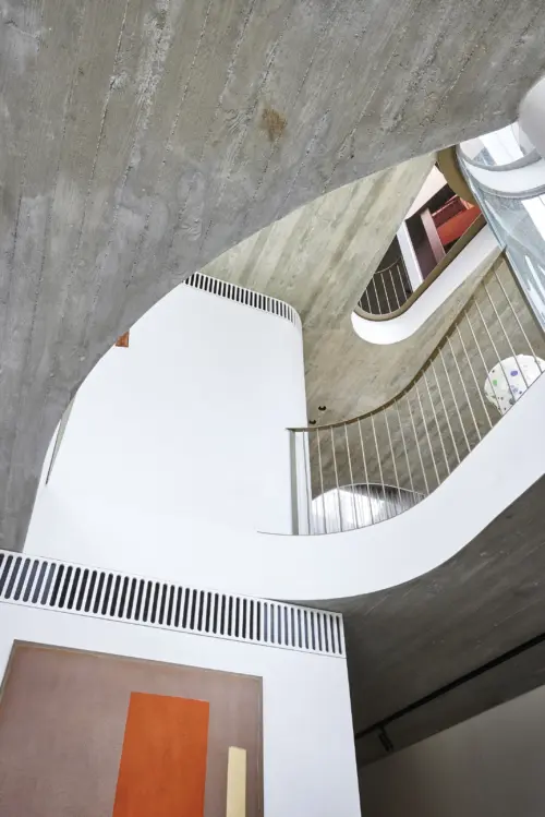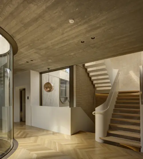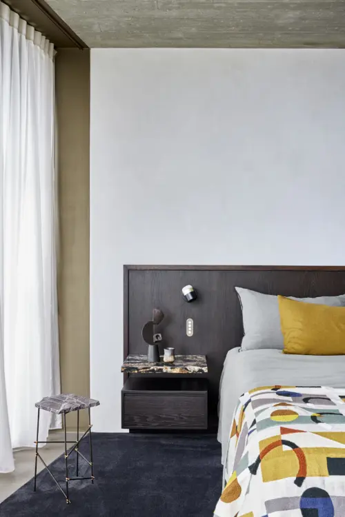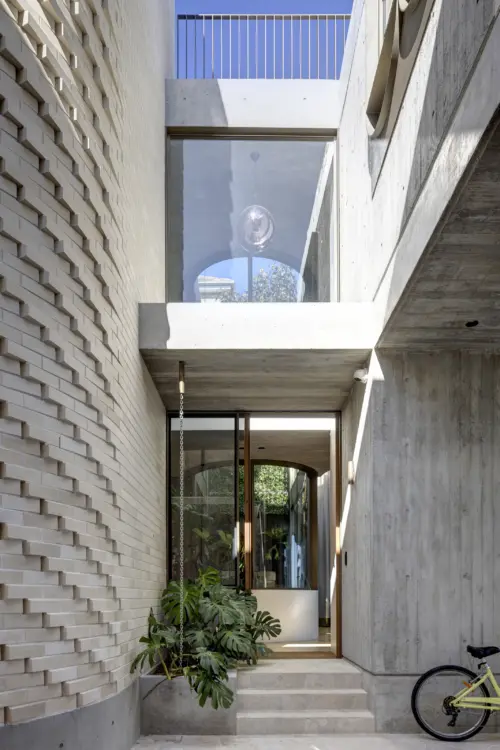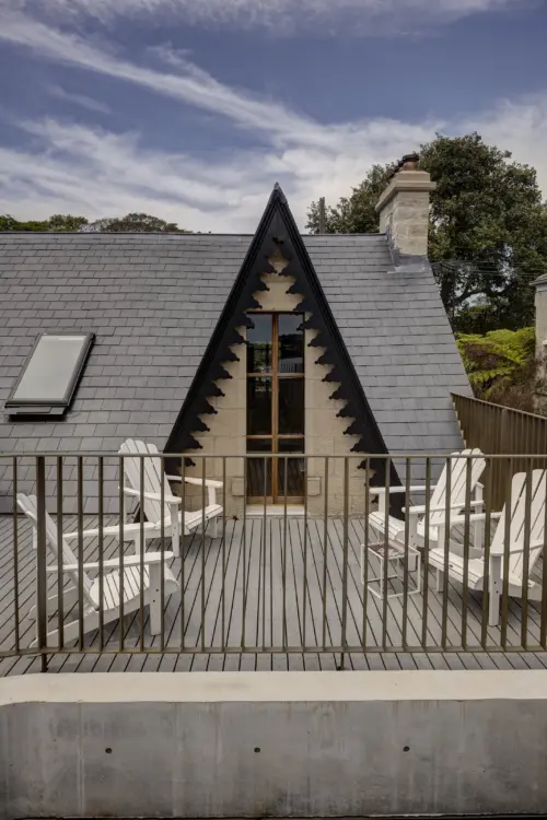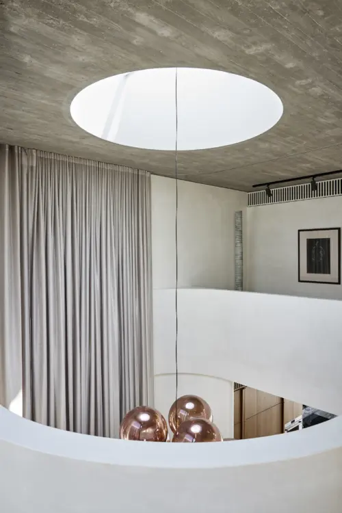 The new plan cleaves into two wings reaching towards the harbour. Rooms are interwoven across these levels, infused with a sense of both the monumental and the playful, social space and the very private. Upper levels see wistfully curved light apertures, carved from the concrete strata, while lower levels reveal the cut sandstone escarpment. A tiny rooftop terrace makes an intimate retreat, while a joyful Juliette balcony looks internally over the stairs from a guest room.